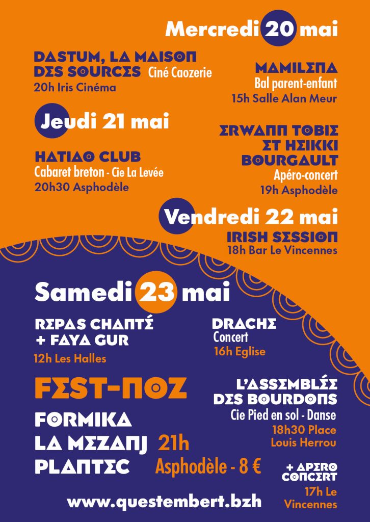 Découvrez la programmation complète du festival. Concerts, conférences et animations se déroulent sur Questembert / Kistreberzh / Qhitembé du 20 au 24 mai 2026.